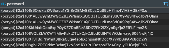 유저가 입력한 패스워드를 Bcrypt로 해싱하여 저장하게 되고, 아래와 같이 DB에 저장된다.