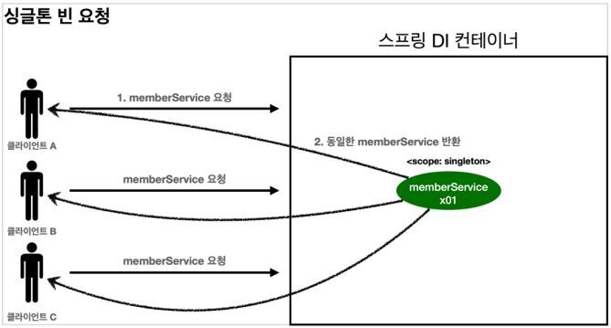 스프링 빈이 스프링 컨테이너의 시작과 함께 생성되어서 스프링 컨테이너가 종료될 때 까지 유지될 수 있는 이유는 스프링 빈이 기본적으로 싱글톤 스코프로 생성되기 때문이다.