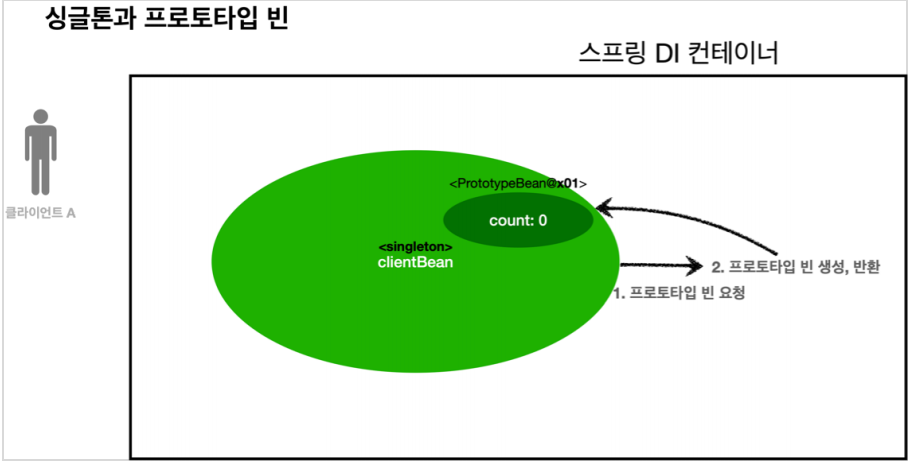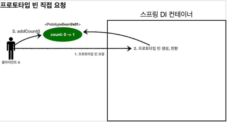 - 의존관계 주입 과정에서 clientBean은 스프링 컨테이너에 프로토타입 빈을 요청한다.