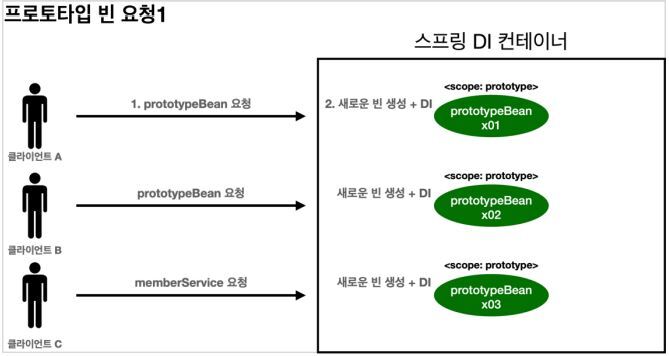 - 스프링 컨테이너에 요청할 때 마다 새로 생성된다.